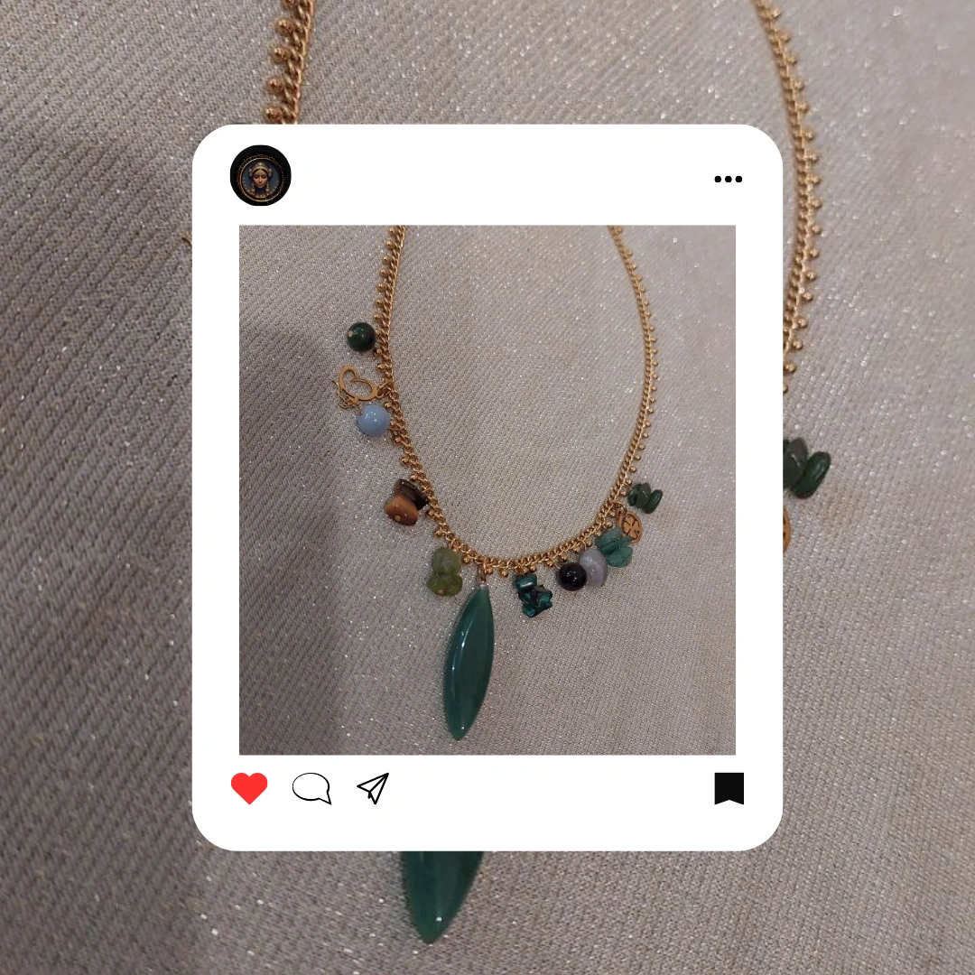 در طراحی این گردنبند از سنگ‌های ارزشمند زبرجد، یشم، مالاکیت، لابرادوریت، تورمالین، چشم ببر، آکوامارین و اونتورین استفاده شده است. آویز بلند مرکزی از جنس سنگ اونتورین طبیعی جلوه‌ای خاص و دل‌انگیز به گردنبند می‌دهد.